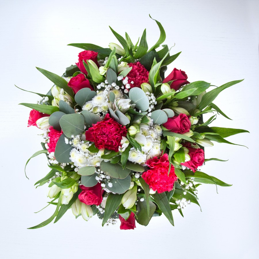 Elevate every occasion with this magnificent bouquet, a true celebration of artful floral design. Featuring the dynamic contrast of bold red roses and elegant white chrysanthemums, the bouquet is tastefully accented with soft carnations and airy gypsophila. White alstroemeria and refined aspidistra leaves add texture and depth to this luxurious display.